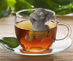A sloth tea infuser hangs on the edge of a mug. The little face looks how you feel at 6 a.m. Bonding with this little buddy first thing in the morning or nodding off sipping chamomile will leave them thinking of you.