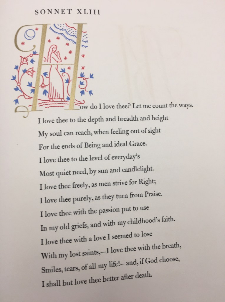 It’s easy to say I’m not romantic. My husband was known as, “jewelry boy.” He brought home flowers each Friday. I have volumes of poetry including the collected letters of Elizabeth and Robert, of Barrett-Browning fame. You know, “How do I love thee? Let me count the ways.” Perhaps I’d have turned pining romantic harpy without all the attention to my heart.